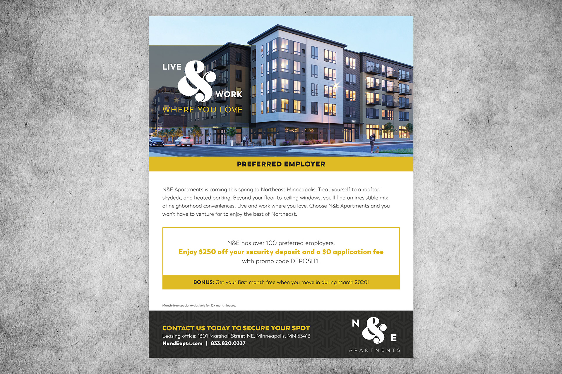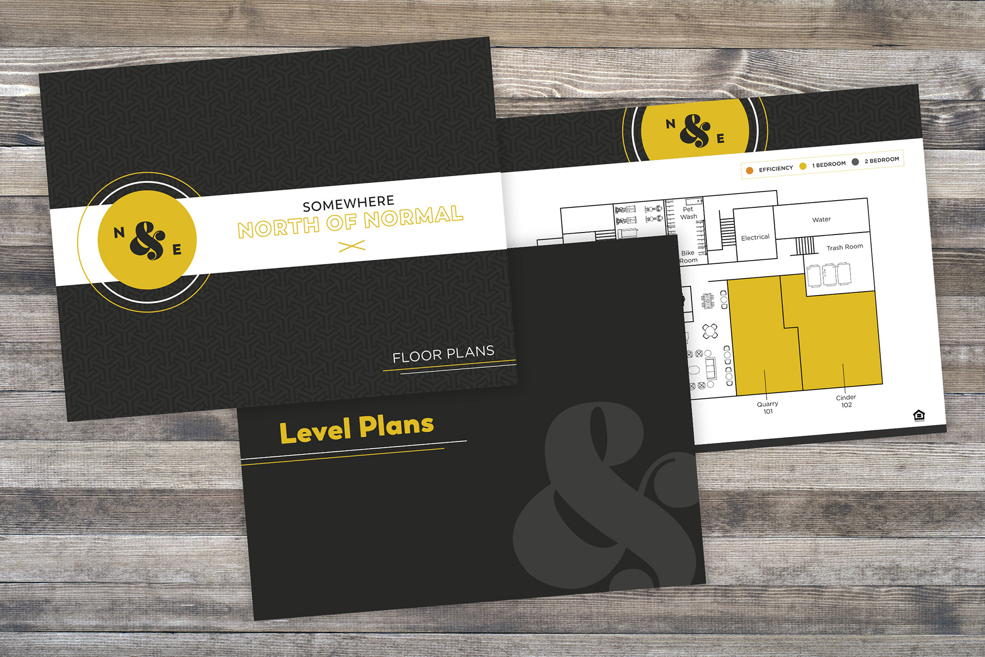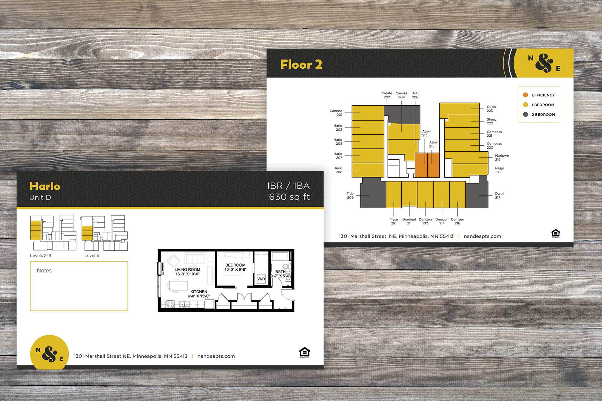 I designed the marketing materials for the launch of a new apartment complex in Minneapolis, MN. Work included floor and level plans to include in sales materials to present to potential residents, flyers, logos and signage.