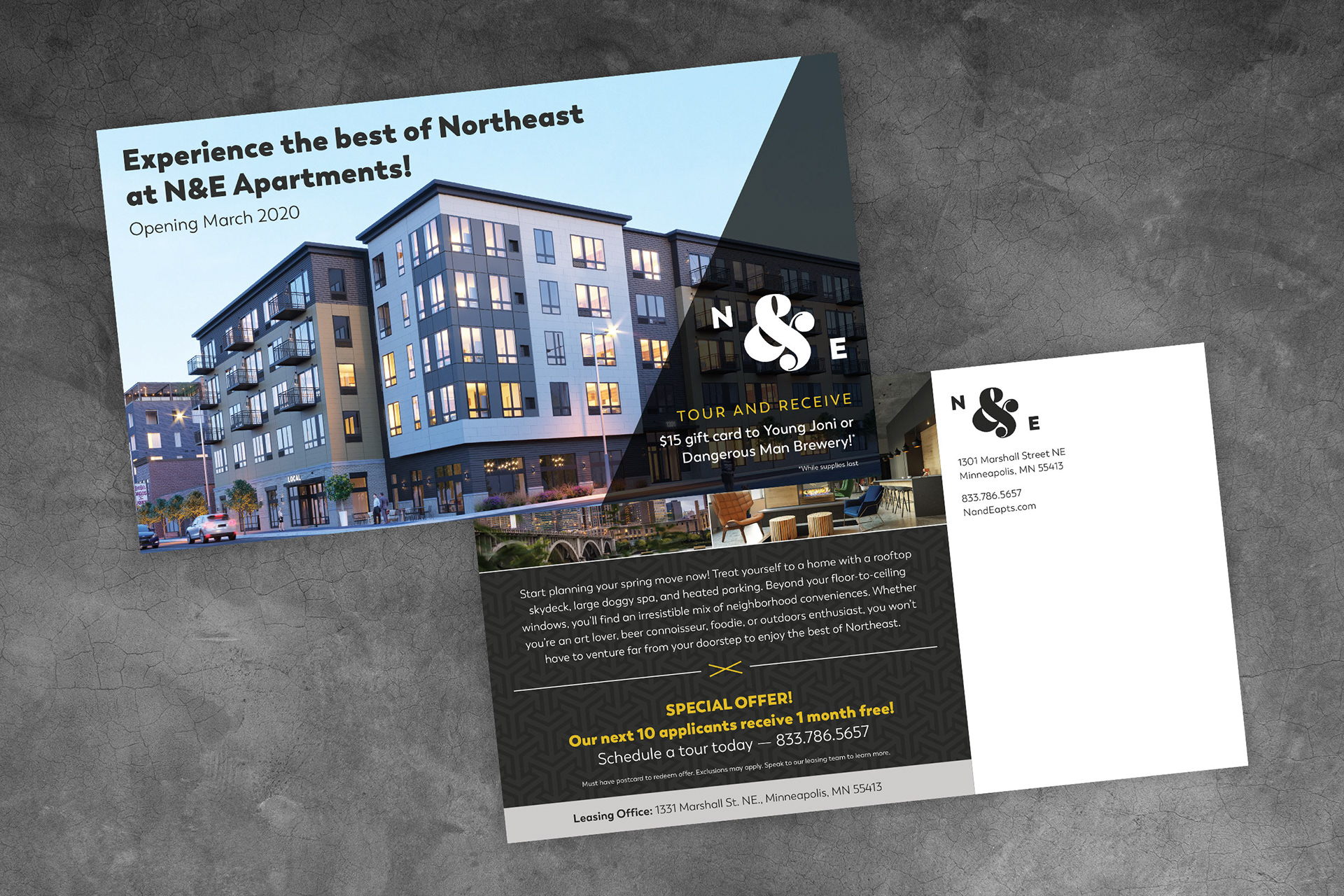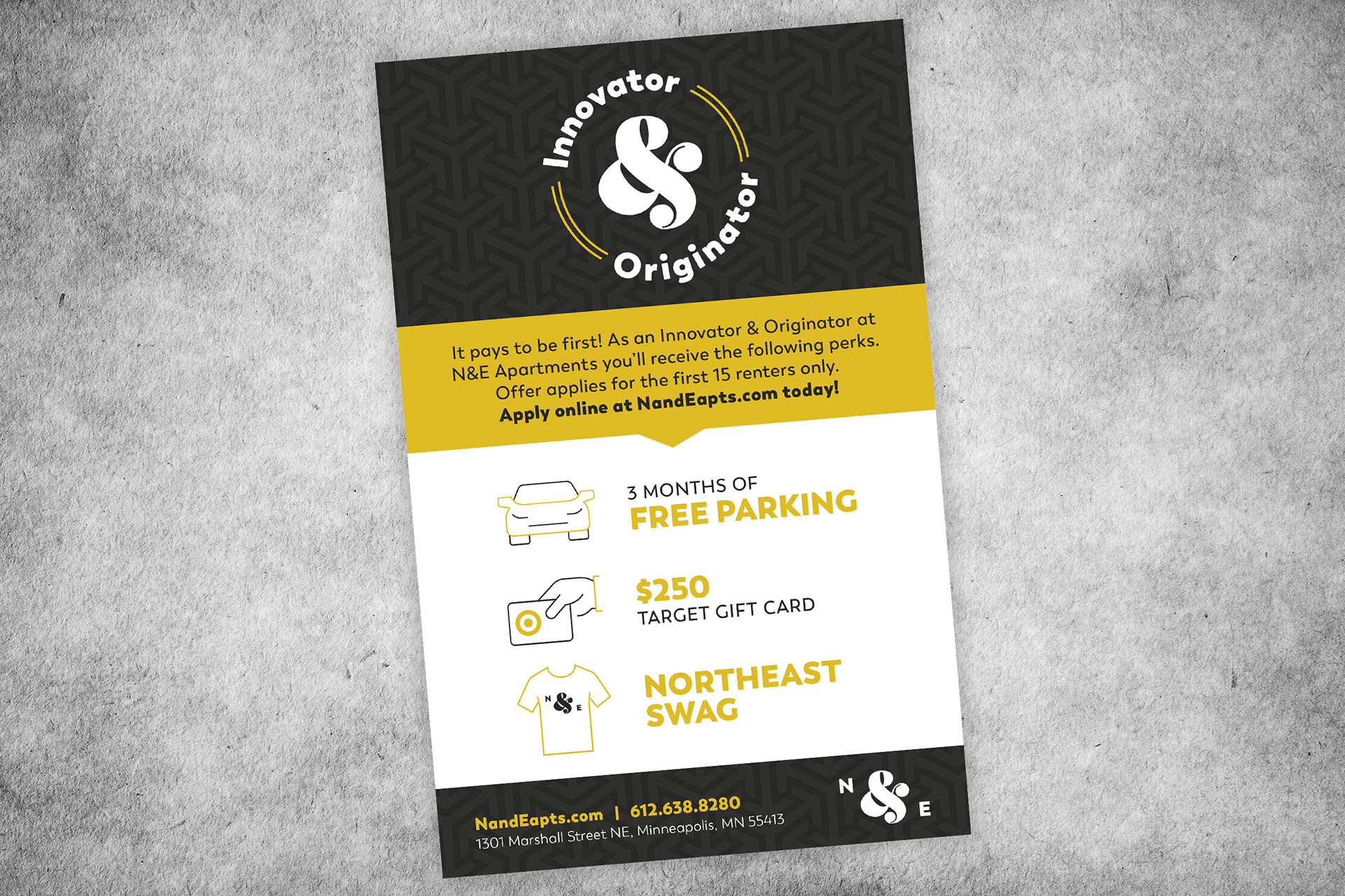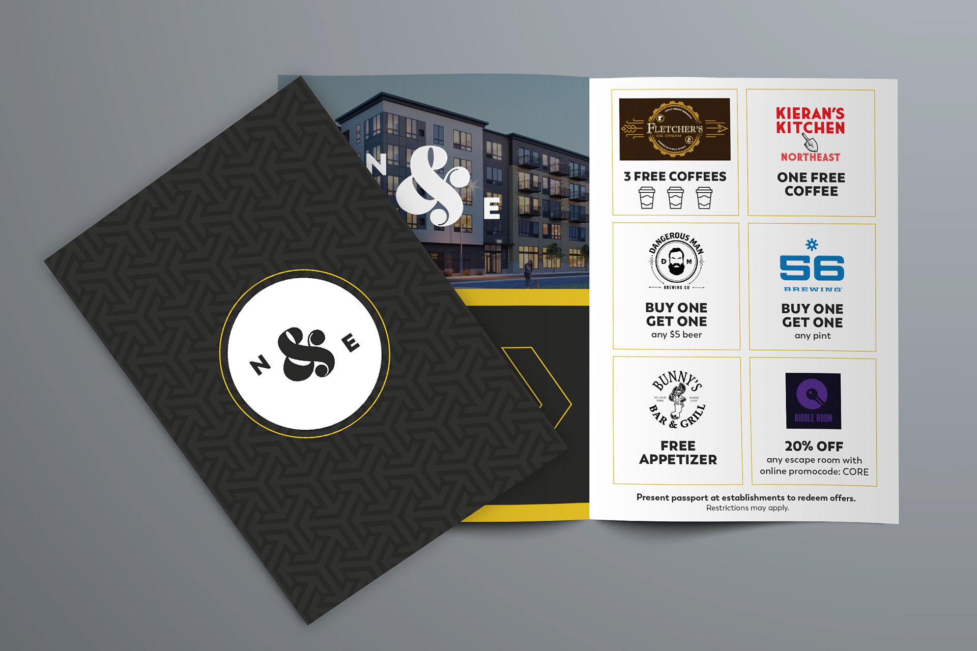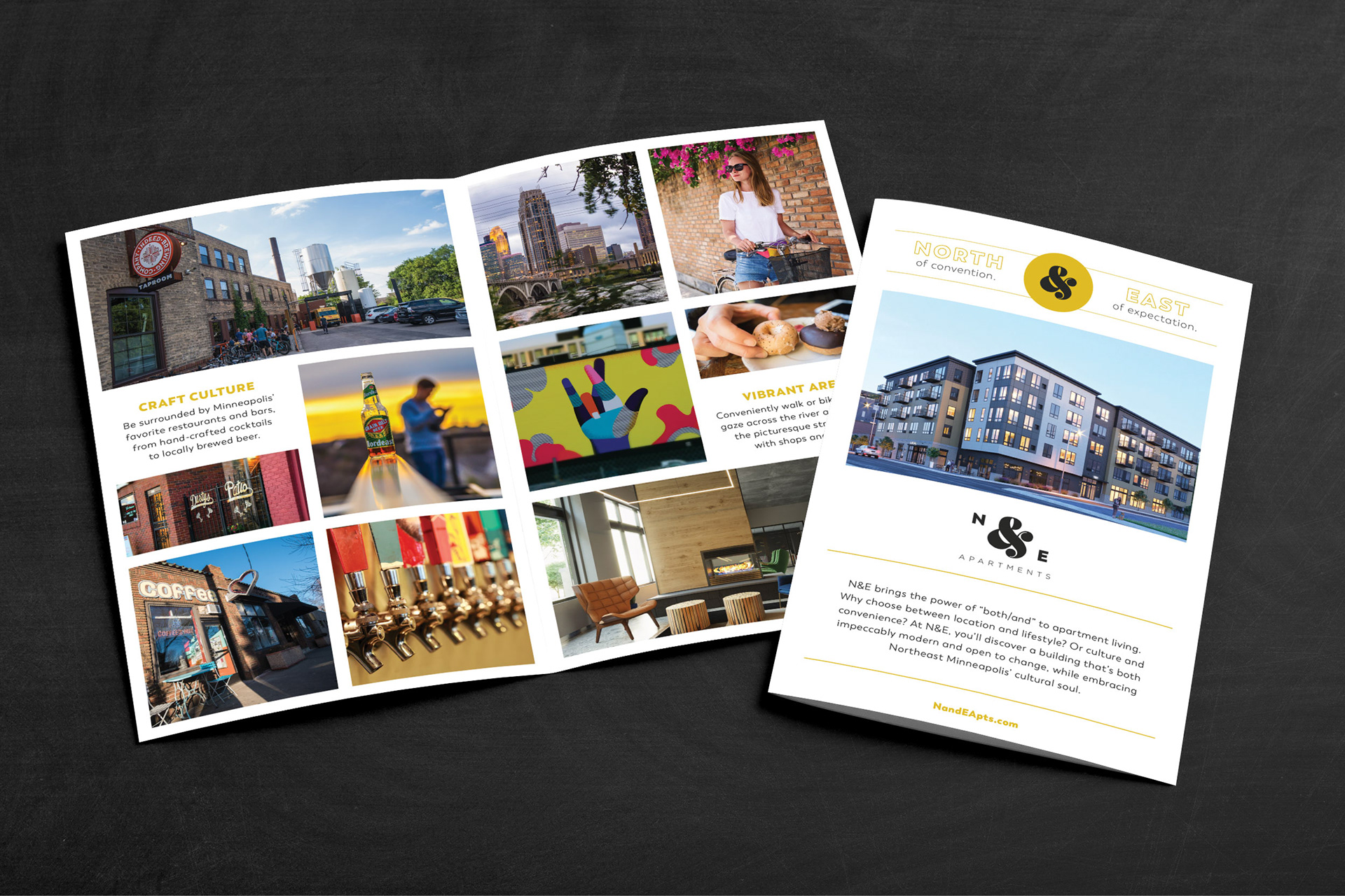 I designed the marketing materials for the launch of a new apartment complex in Minneapolis, MN. Work included floor and level plans to include in sales materials to present to potential residents, flyers, logos and signage.