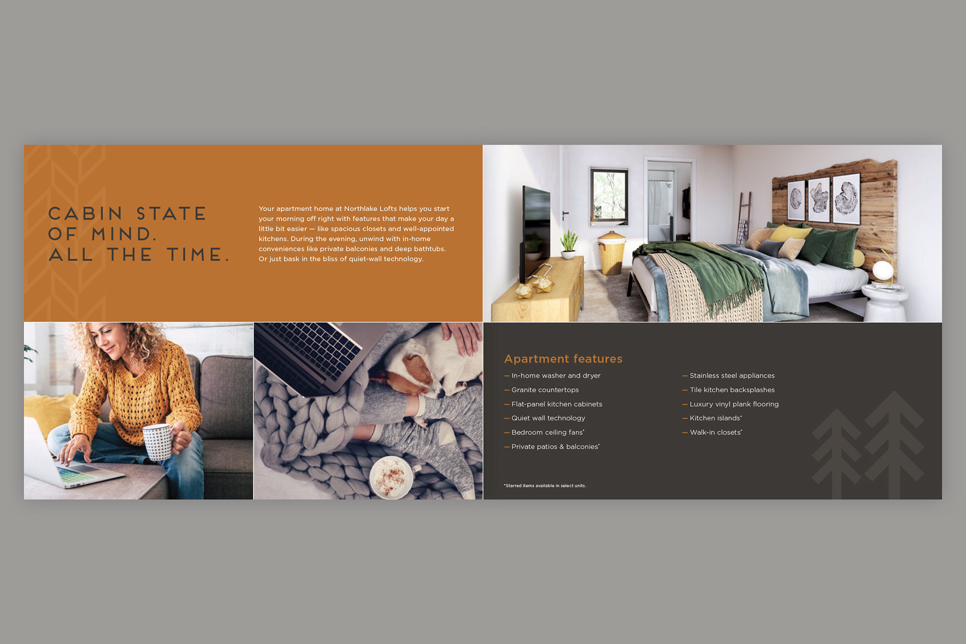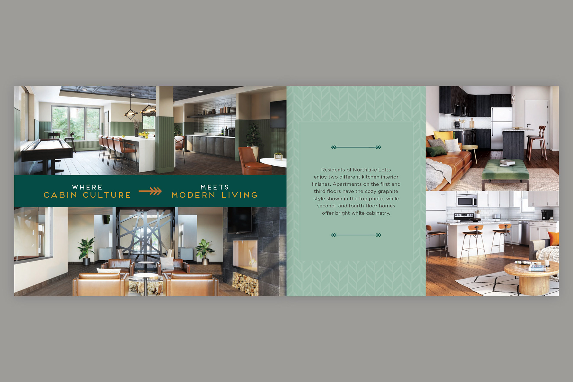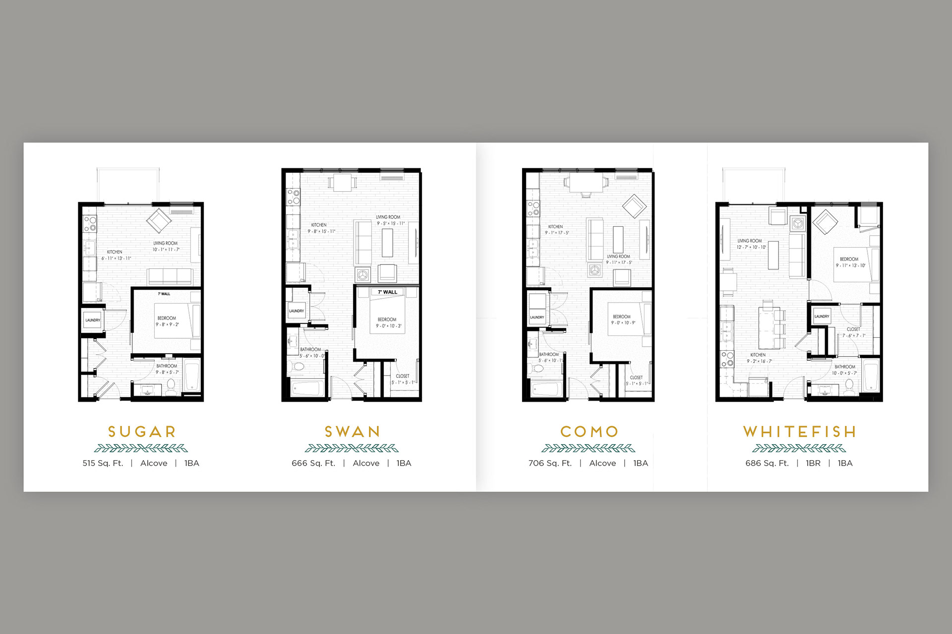 I designed marketing materials for the launch of a new apartment complex in Lakeville, MN. Work included floor and level plans to include in sales materials to present to potential residents, business cards, flyers, brochures and their website.