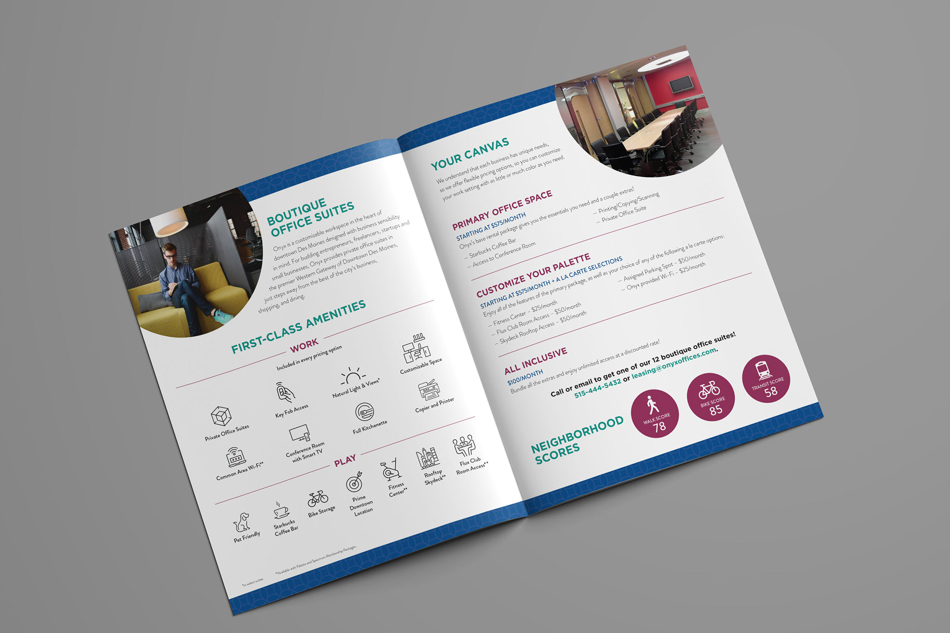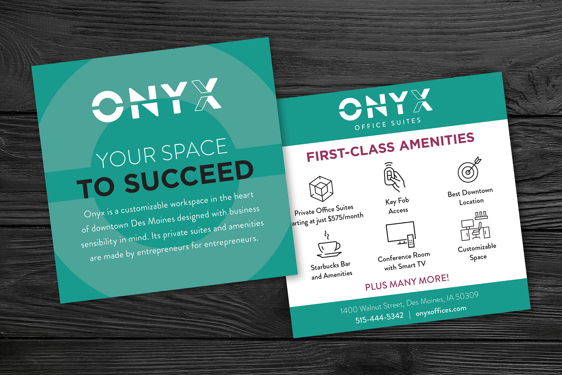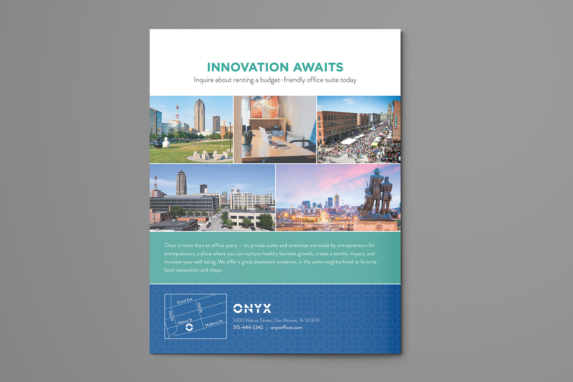 I designed the branding and marketing materials for the launch of a co-working office space in Des Moines, IA. Work included logo design and branding elements, handout cards, brochures, motion graphics and signage.