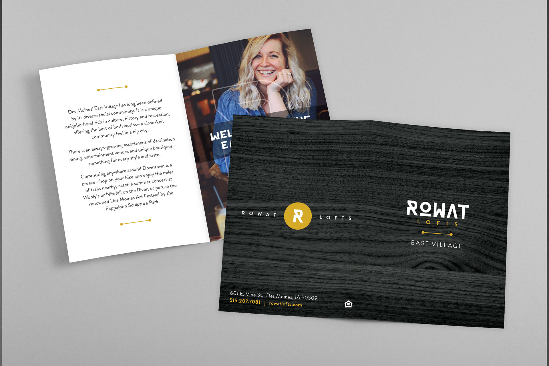 I designed the marketing materials for the launch of a new apartment complex in Des Moines, IA. Work included floor and level plans to include in sales materials to present to potential residents, brochures, business cards and flyers.