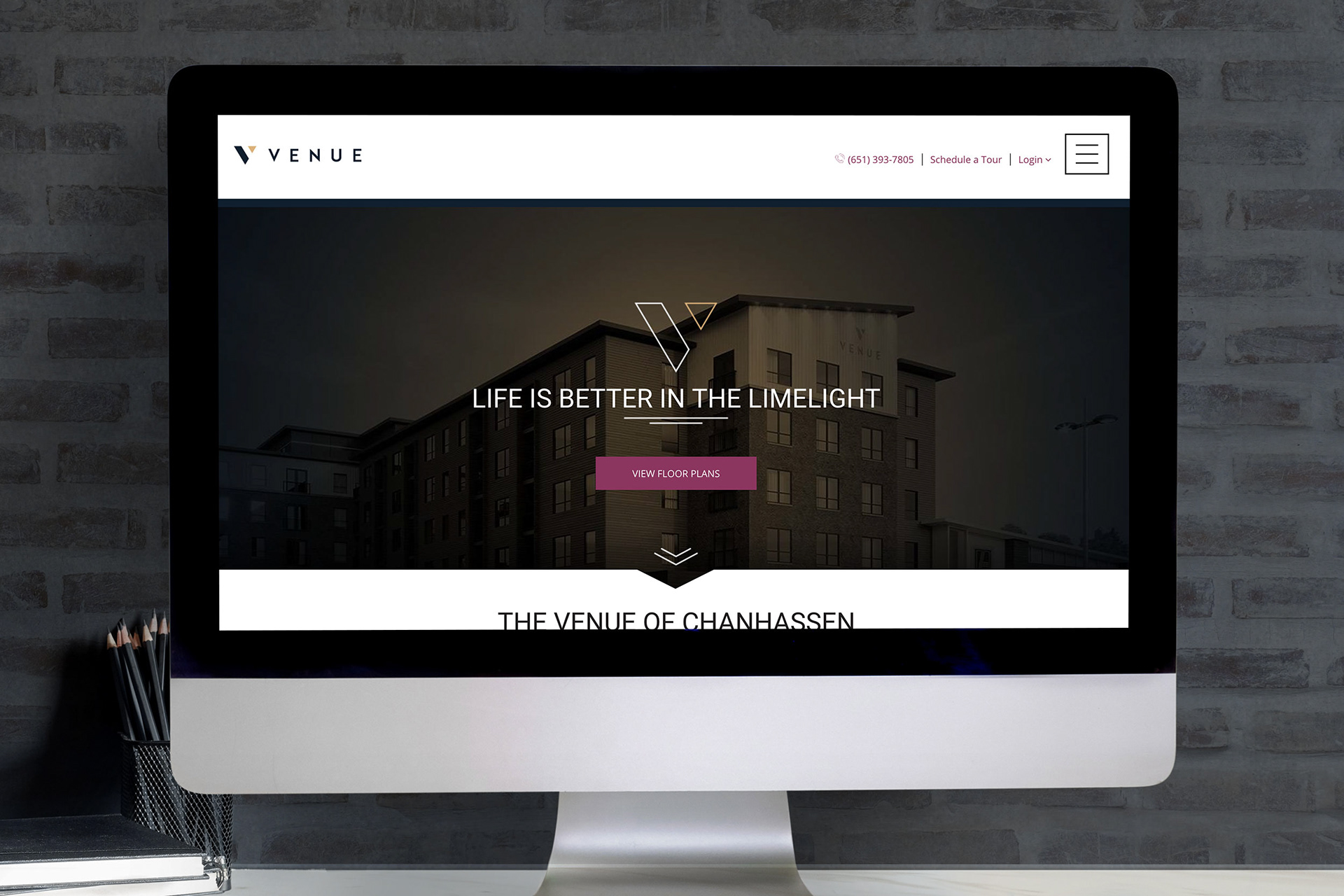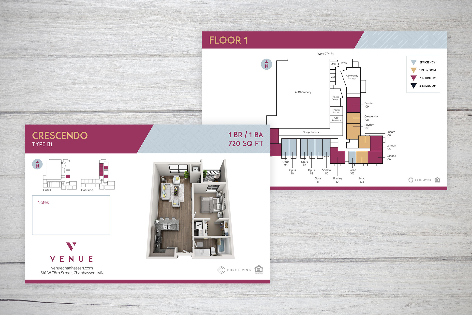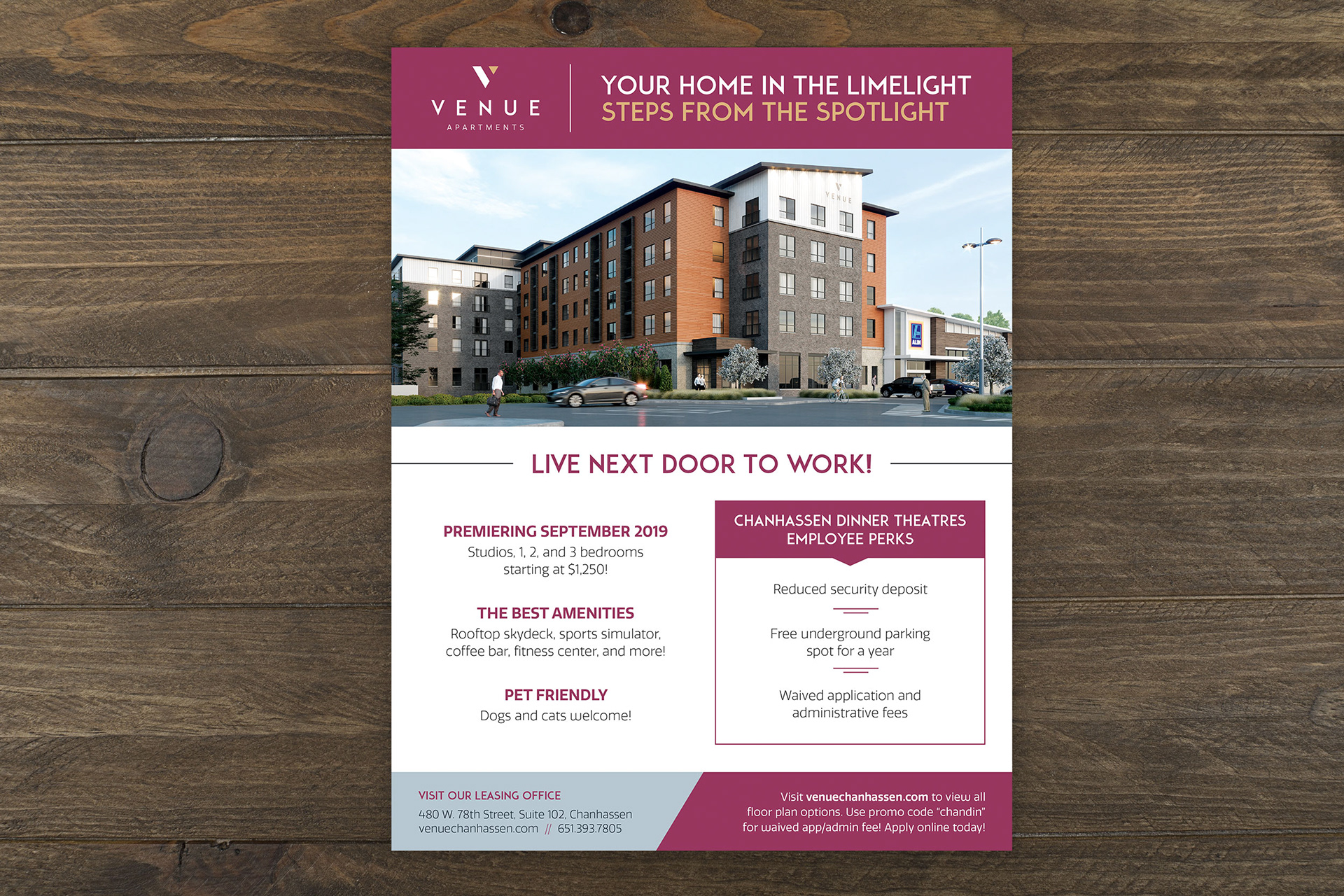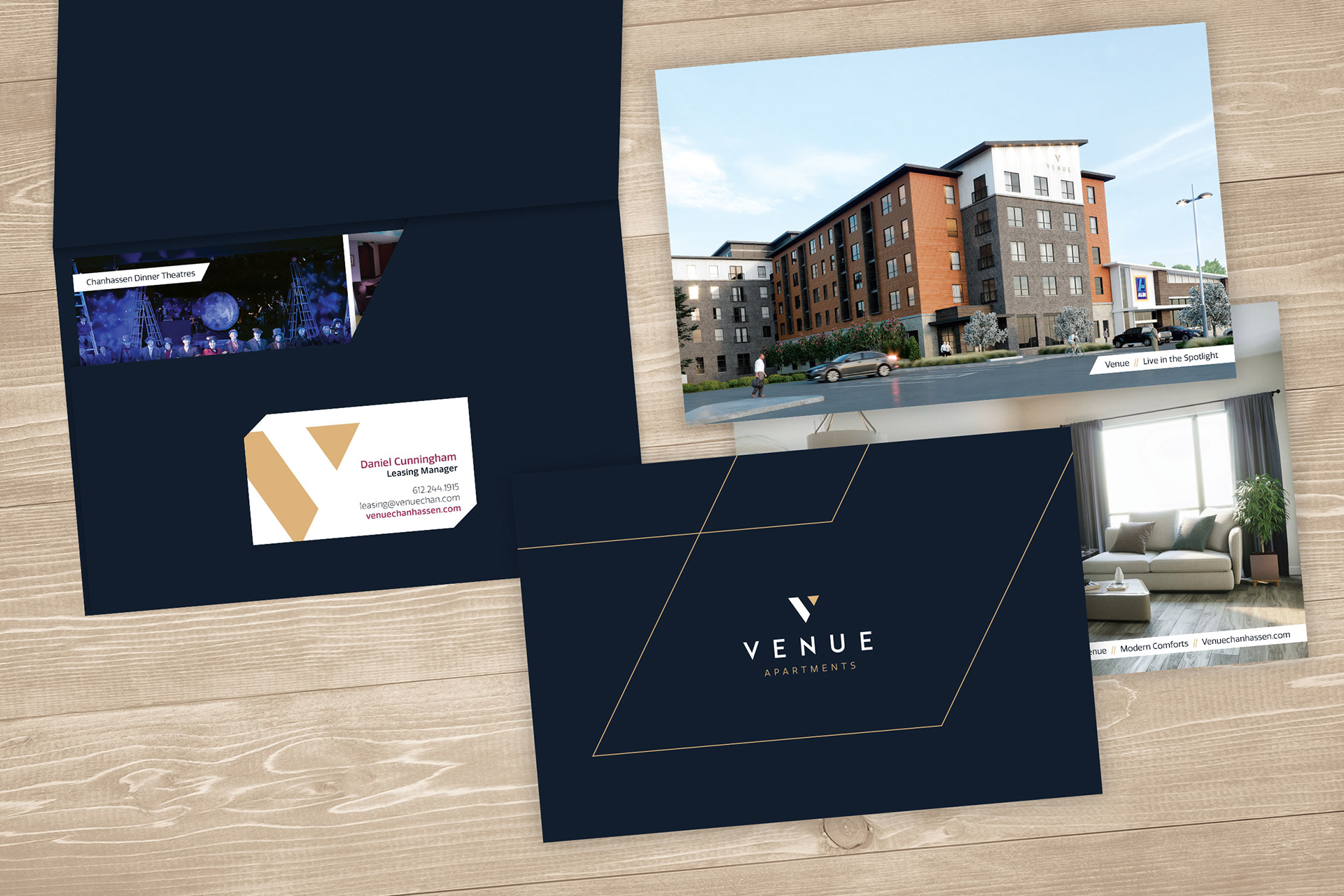 I designed marketing materials for the launch of a new apartment complex in Chanhassen, MN. Work included floor and level plans to include in sales materials to present to potential residents, flyers, business cards, signage and their website.